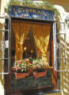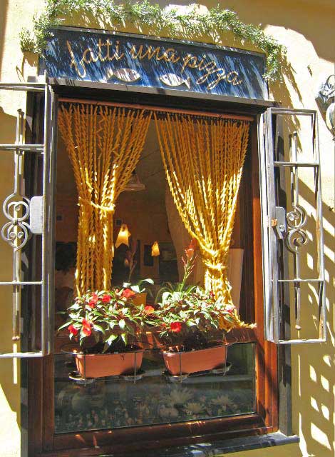 We stopped for a piece of pizza, sold by the slice. We crouched on a stairwell in the street to eat it, as is the custom. I was attracted to a unique window dressing, the curtains made of pasta! |