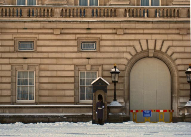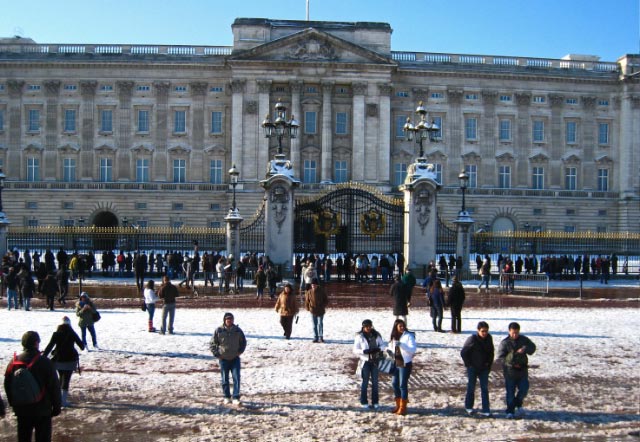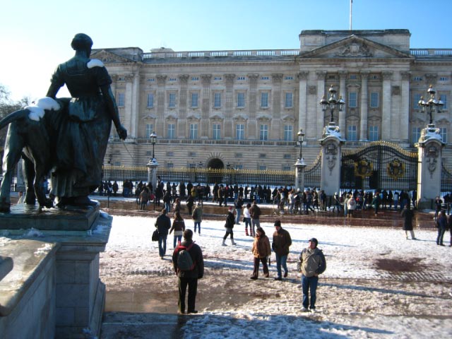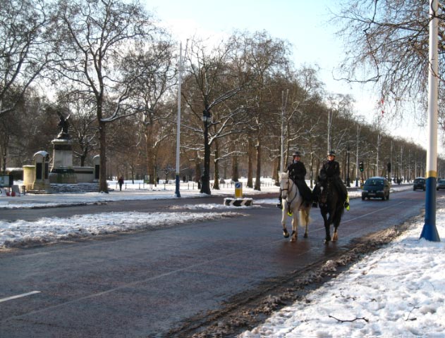 So we decided to walk to Buckingham Palace. We picked our way over the icy walkway along the "Mall" paralleling a busy street patrolled by police on horses. |