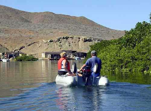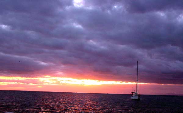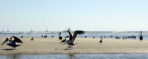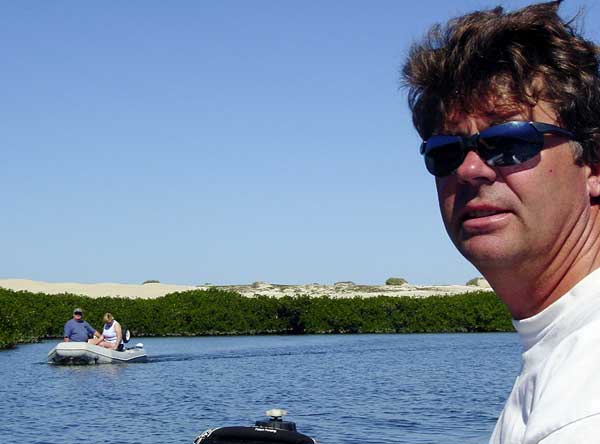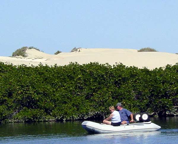 EXPLORING THE MANGROVE SWAMP November 27 It was a bright and sunny morning with the promise of a hot afternoon so we decided to take a ride over to the mangroves with Dale and Gary in our dinghies. It was a bit daunting getting through the surf at the entrance to the lagoon, but not as bad as it looked once we were inside. Having been deprived of greenery for quite some time, the vegetation of the mangrove swamp was a real treat. | ||