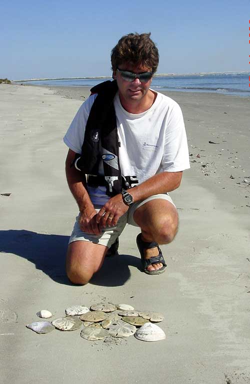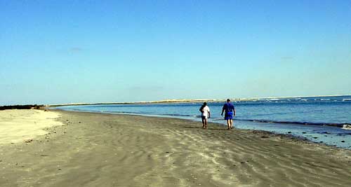 The beach was a beautiful white sandy strip that went for miles. We were the only ones there. Note the boats anchored past the surf in the picture. The beach has been nicknamed "frisbee beach" because there are literally hundreds of sand dollars everywhere you look along the endless span of sand. | ||