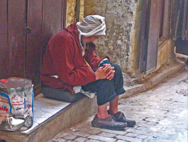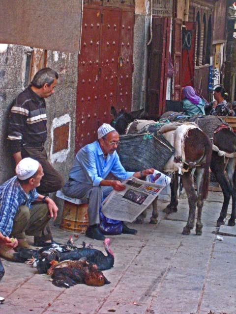Moroccan life in Fes, men taking a moment from selling
