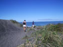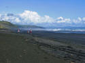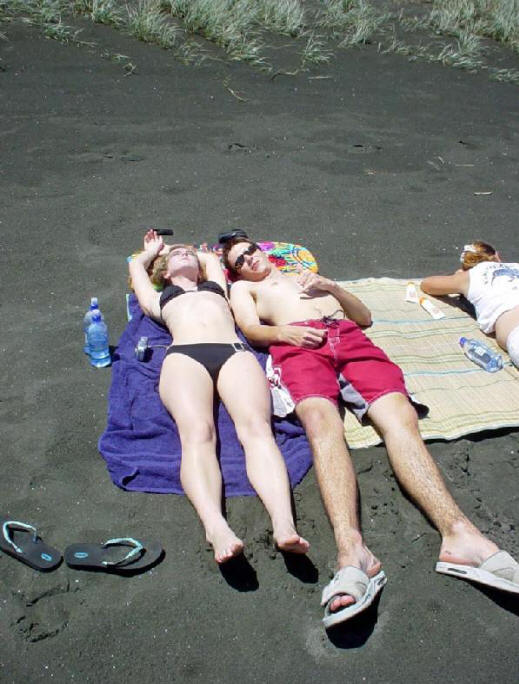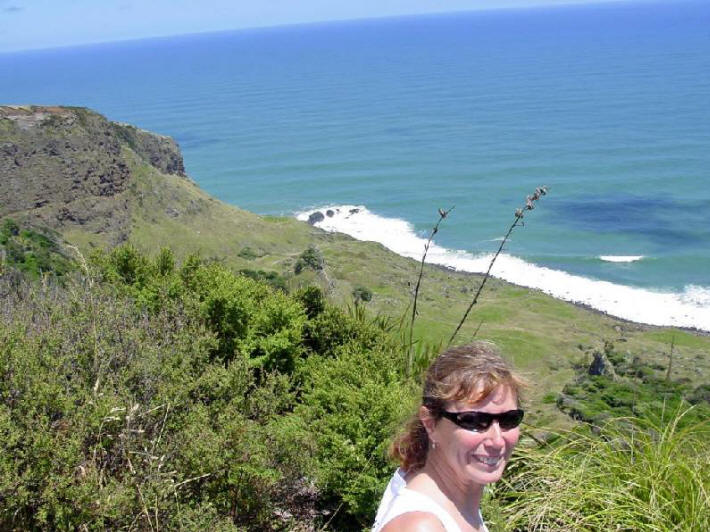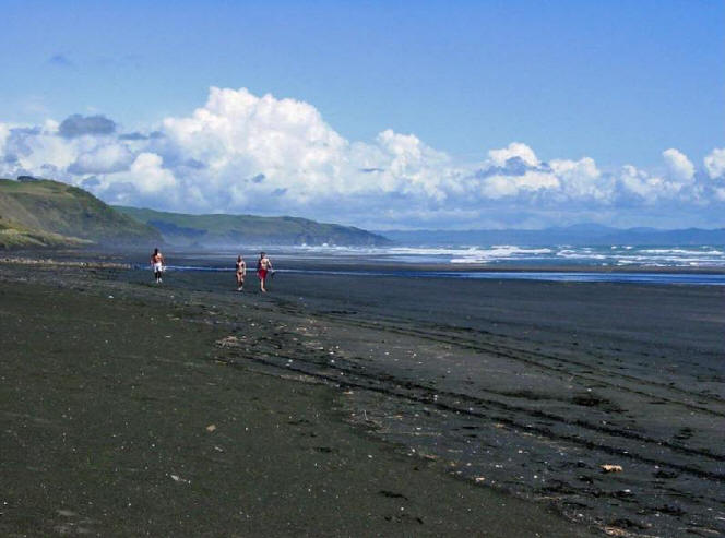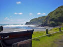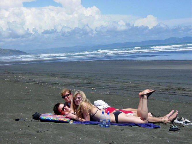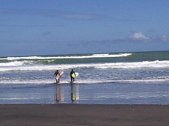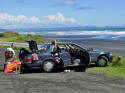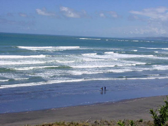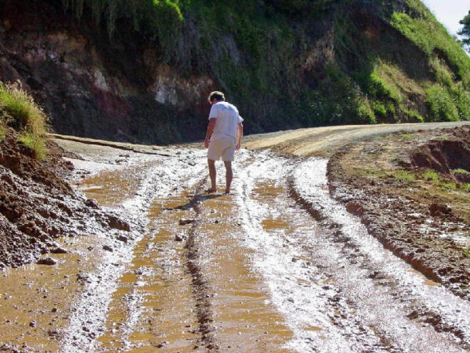 We had driven for most of the day and were within 10 km of our destination of Kawhia. We had made reservations at a motel there and we would arrive almost on time. Suddenly we came upon a sign that said SLIP. What is a Slip? we all wondered. Around the next corner we got our answer. The road was completely washed out as a result of all the rain. Chris got out to assess the situation but, while probing the depth of the washout, his shoe was sucked off his foot and buried in the sticky, gooey red mud. Gord removed his footwear and waded through the slop to recover the shoe. We decided that this was one challenge that Norman wasn't up to so we had to turn around and drive all the way back to Raglan, then take the highway route to Kawhia. |