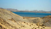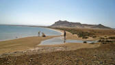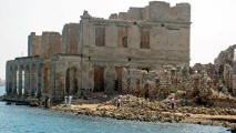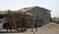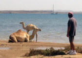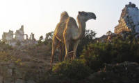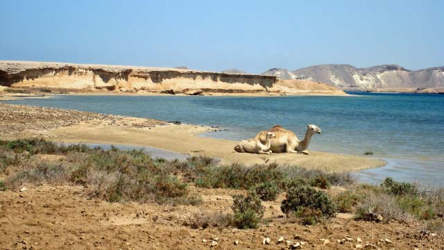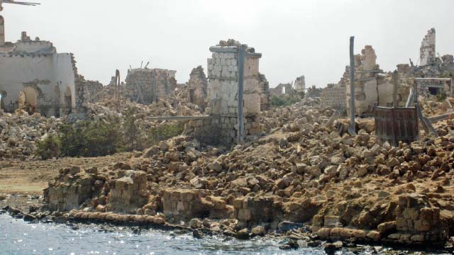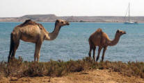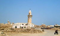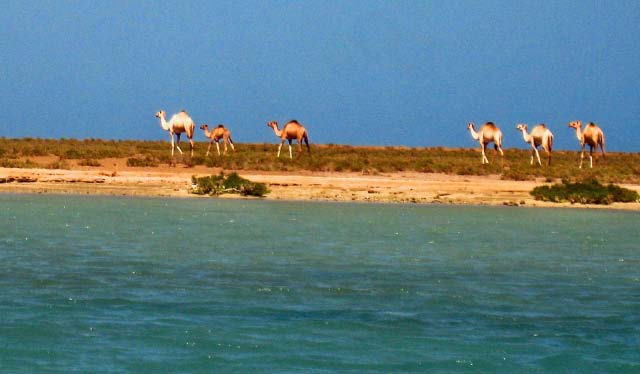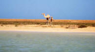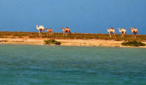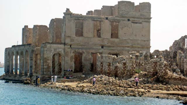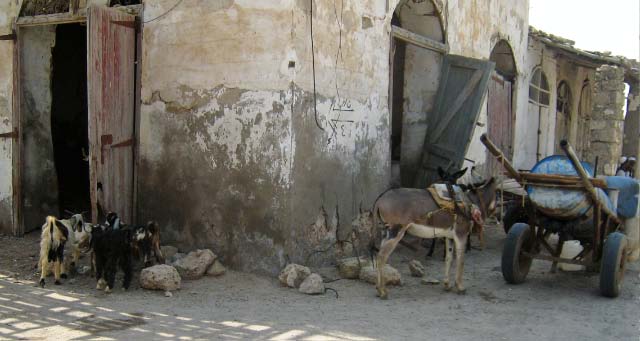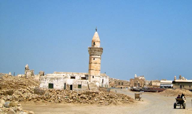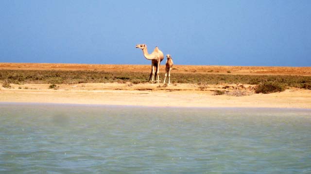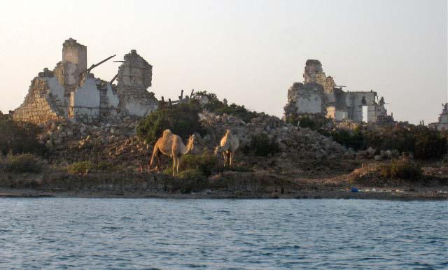 In 2003 all buildings, which need constant maintenance, had collapsed although some were still inhabited as recently as the 1960's. Now the site is home to numerous camels that roam the shoreline. |