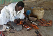 Port Sudan March 20 We took a local bus to Port Sudan to find some groceries and a market. The bus does not leave until it is completely full, which includes jump seats pulled down to fill the isle, so once your in, your crammed amongst the locals. On one side of me an Arab, head wrapped loosely in a rag, polished his huge elaborately carved sword with the side of a coin; on the other side a women mostly covered, with a baby on her lap, was adorned with large rings thru her nose, on her fingers and even on her toes! Her hands were henna tattooed all over. |