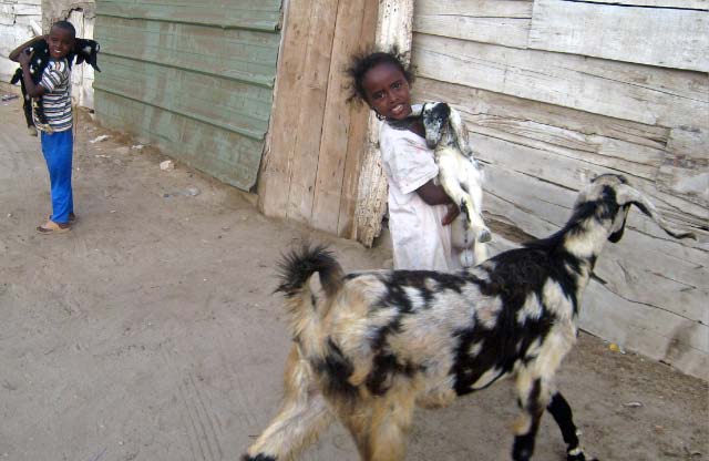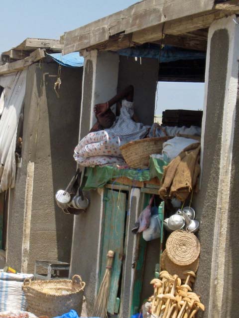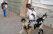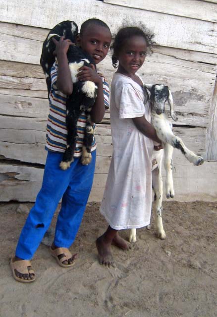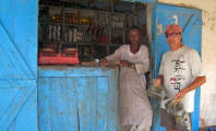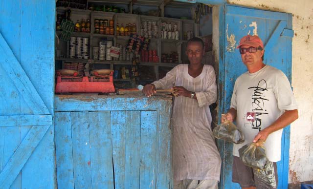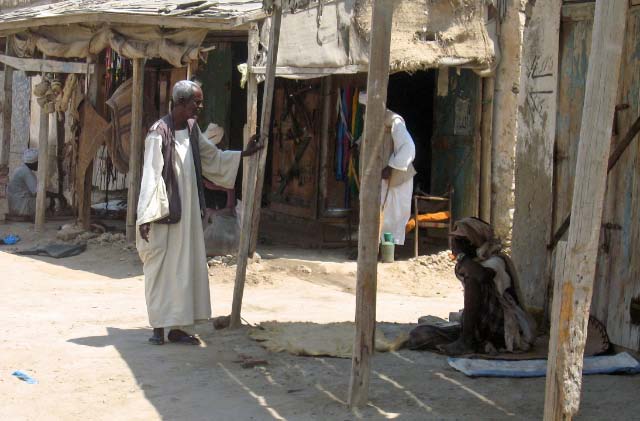 and nothingness. Port Sudan was a haven for picture taking but that is forbidden. Whenever our cameras came out someone would approach and say "no photos" and the police threatened to take Becky's camera away! A man on the bus told us that Americans relate to CIA so they must think we are all spies! The streets were full of donkeys and goats and more goats, chewing on the produce for sale at the market. Fresh goat and chickens were strung up and even bloody Angora goat hides were offered for sale. We bought a few fresh veggies but there are no supermarkets as such so I will have to make do with the dwindling provisions on board. All the shops sold the same things, which put bargaining skills to the challenge. |