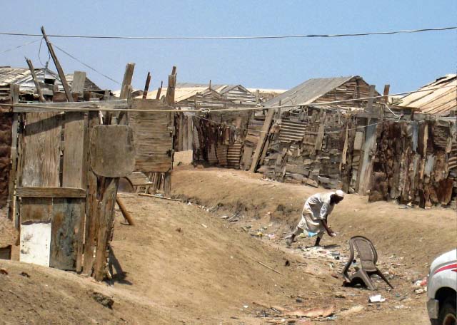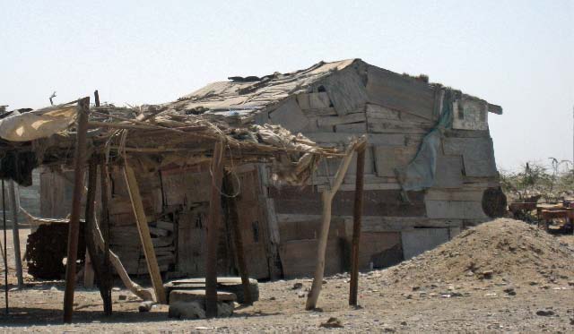 Ramshackle shanties, sticks and burlap |
