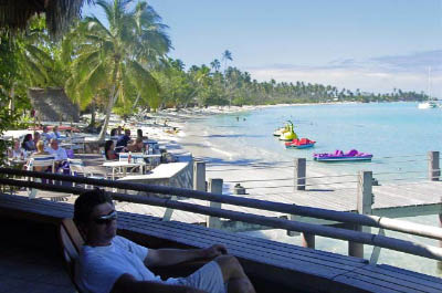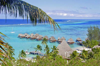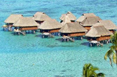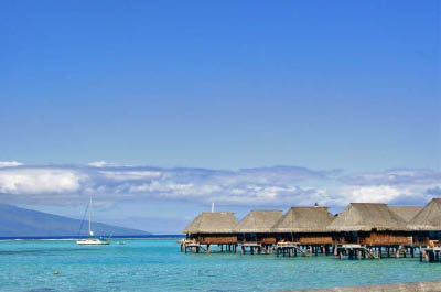 In keeping with the Polynesian flavour, the hotels have adopted the format of thatched roof cottages over the lagoon, rather than high-rise hotel buildings. We were quoted $1000 US per night at one of these resorts! | ||