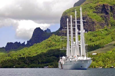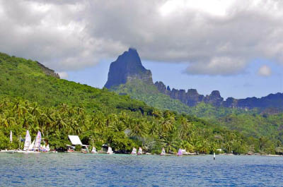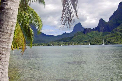 July 16, 2004 We moved the boat to an anchorage just inside the reef in the adjoining Bay of Opunohu which was very beautiful but a little more busy than what we had been use to. There was a local school of sailing dinghies all around on most days, very colorful but you had to watch out, as one bonked into the side of our boat one day. The sailing cruiseship "Windsong" seemed to anchor almost everywhere we went. | ||