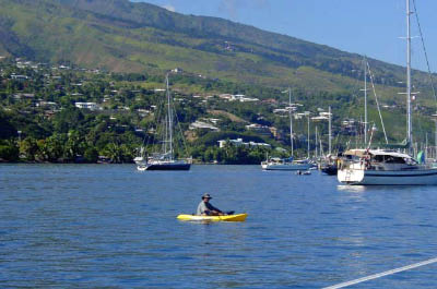 Maeva Beach Chris came out to greet us in his kayak. We agreed to anchor near him so we could share transportation. We had the dinghy (he lost his in Nuka Hiva)...he had a working motor. |