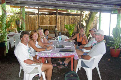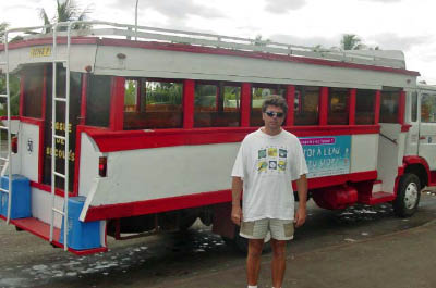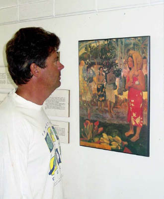 Stardust, Solstice, Sowelu and ourselves thought we could catch a bus without too much trouble. We did not know that the buses did not run on the weekend but that didn't turn out to be a problem because an empty school bus stopped and offered to take us all the way to the Gauguin museum, about an hour's drive away for $2 each. The trip itself was worth it as we got to see some scenery from another part of the island which was much lusher as the result of more rainfall. However, I was disappointed that the vision I had always had of the enchanting Tahiti, with long white sand beaches fringed with palm tree really only exists sparsely in front of the few exclusive hotels. For the most part, the shoreline of Tahiti is shallow and rocky with muddy black sand at best. |
