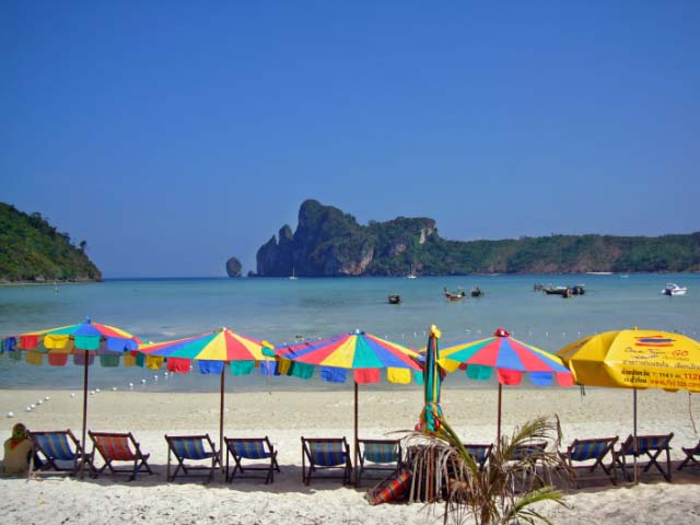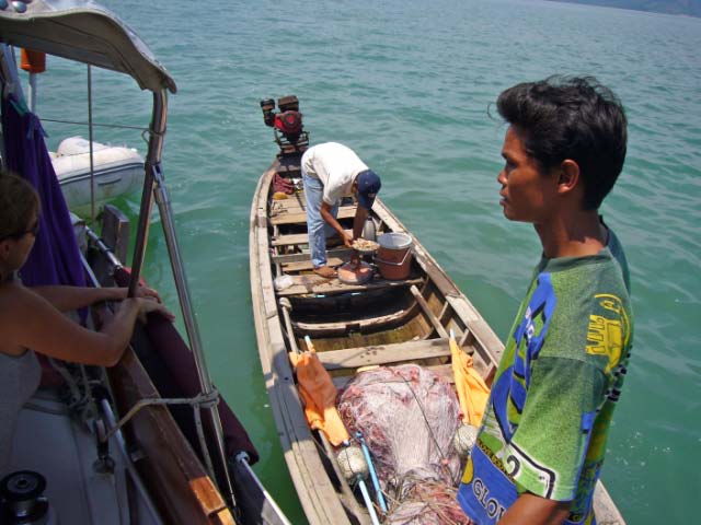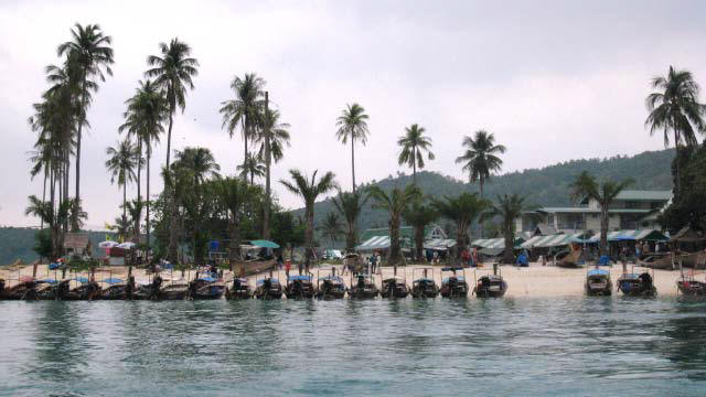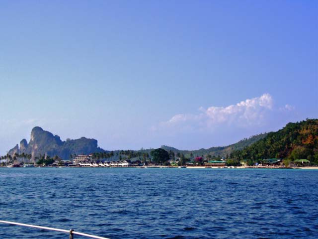 PHI PHI DON We rounded the corner of Phi Phi Don and headed to the bottom of Ton Sai Bay, the hub of activity, with the assortment of resorts, all rebuilt after the recent Tsunami. We found a hole between fishing boats and set our anchor. |