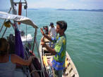 KO RANG YAI March 10 Leaving the pillars of Phang Nga Bay behind, we had a good sail, actually with some wind, to our next destination of Ko Rang Yai. The island boasts a pretty beach and a little resort that seemed to be the favorite camping area of the locals. |