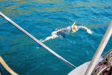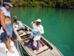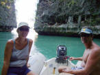 Swimming to Music At our favorite snorkel spot opposite the Hole in the Wall we tied our dinghy to a ball and joined a huge flock of other swimmers in the water. One of the longtails provided background music that reverberated off the surrounding cliffs. As usual the snorkeling was great, especially since some of the tour boats were attracting fish with food. We spent a while there and by the time we left, we had the lagoon to ourselves. |