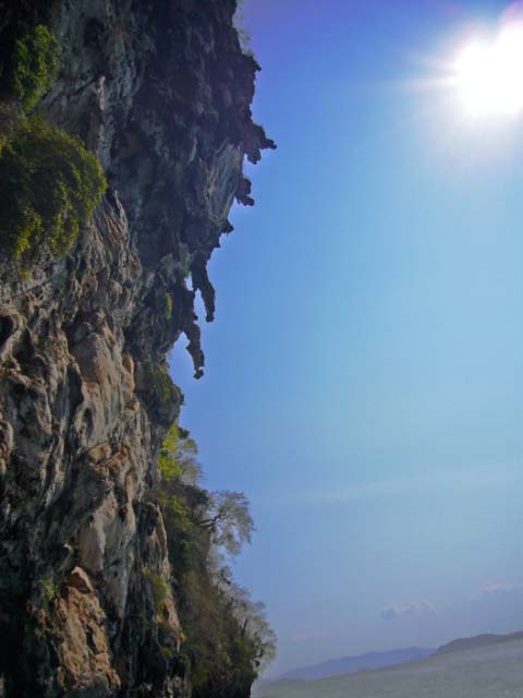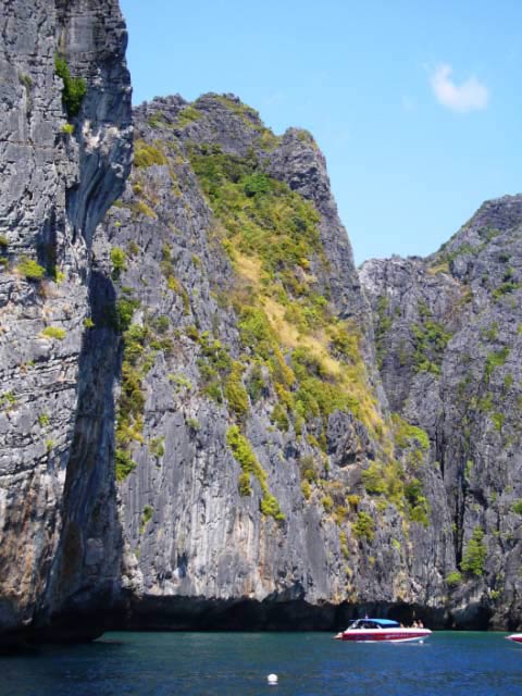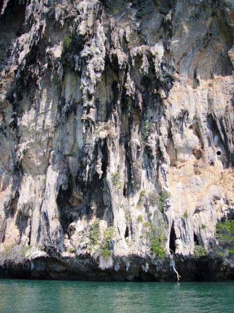 As we rounded the dramatic gigantic rock face on the end of Phi Phi Lei we noticed rock climbers secured by their ropes at an alarming altitude. We also noted the bamboo scaffolding used by the locals to climb amazing heights in search of bird's nests. |