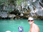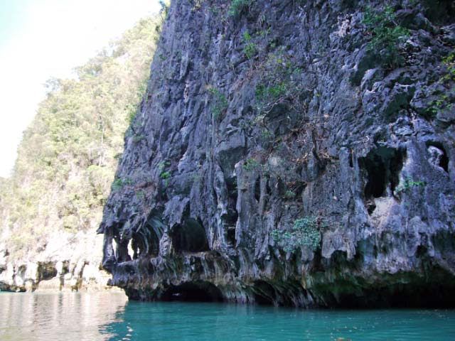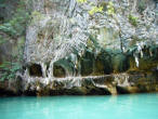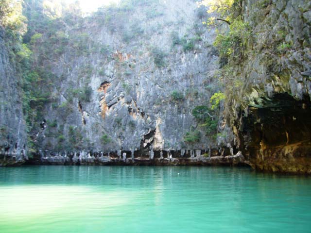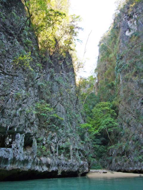 We waded into the dark passageway, our torch lighting our way. We had to be careful to watch for the low overhanging rocks and duck to avoid a collision! We emerged into the bright hong, a Jurassic Park like hidden 'room' tangled with mangroves and bounded by sheer walls alive with climbing foliage. |