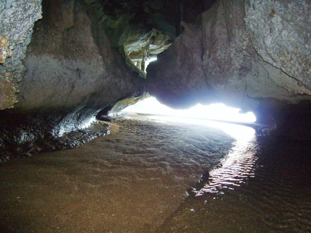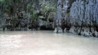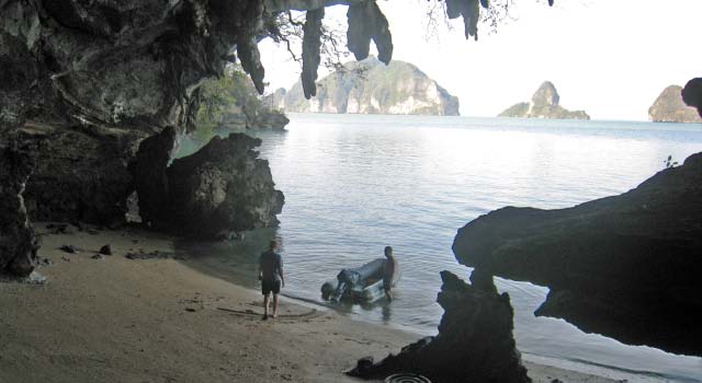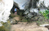 Wading to the Hong A patch of sand spilling between two limestone cliffs attracted us to beach the dinghy. By wading through the silty water around a rocky overhang, we came upon a small opening under the boulders where a creek emptied into the sea. |