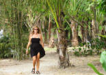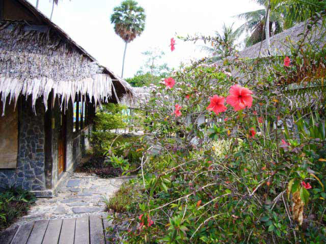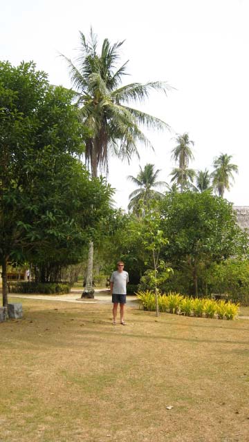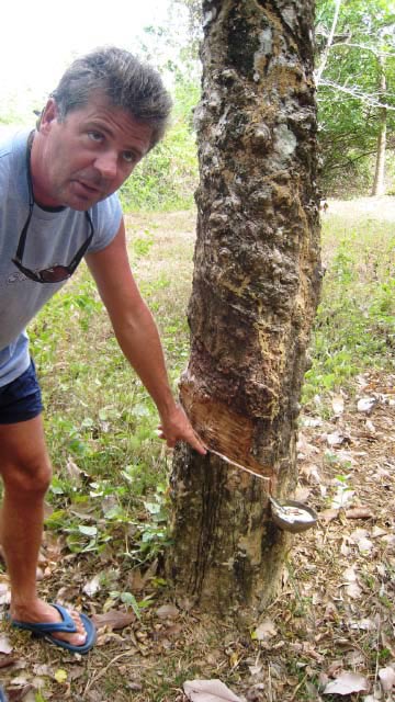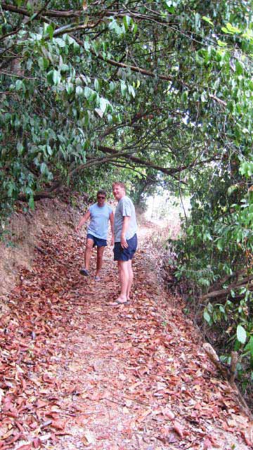 Hiking We hiked around the island along a trail bordered with rubber trees. At the base of the spindly rubber tree trunks were the collection cups full of gooey latex. The path twisted along the contour of the island, passing some lovely bays. |