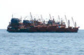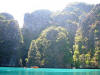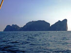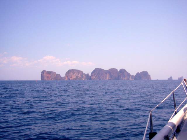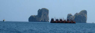 PHI PHI LEI As Phi Phi Lei came into view we set our course for Maya Bay, looking forward to a swim. A group of Thai fishing boats were rafted together at the anchorage entrance |