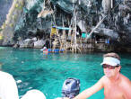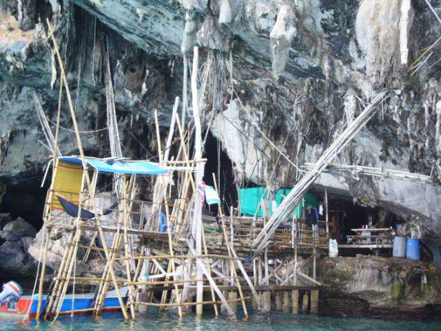 Viking Cave Just north of Maya Bay is a huge cave, closed to the public, but we could see it clearly by dinghy. The cave is laden with a network of rickety tall bamboo trellises extending upward into the gloomy upper recesses of the cave's ceiling. Skilled workers dangerously climb to the highest reaches of the cave in search of delicate swiftlet saliva nests. |