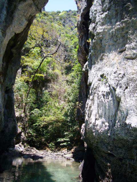 We squeezed through a narrow opening between two rocks and was able to enter a tiny lagoon where a tree chokers full of bats harboured a ruckus of squeaking activity. |