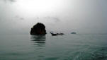 Once anchored, we jumped in the dinghy as the mind-boggling rock