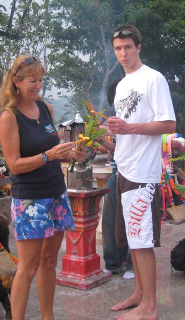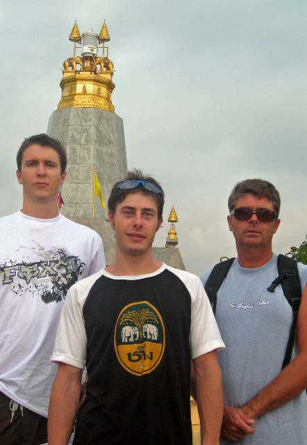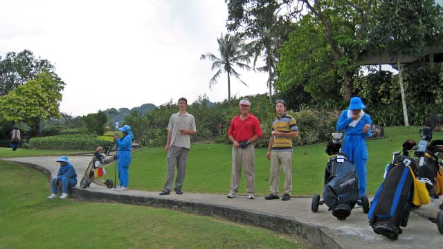 A Day of Golf Chris and Craig experienced a round of golf with Liam and Annie at the Phuket Golf Club, an elite 18 hole course. The boys had to buy pants and long sleeve shirts to meet the dress codes. Each had a private caddy, all dressed completely covered for the part. |