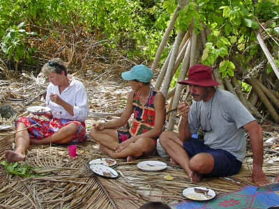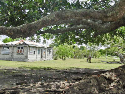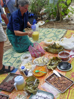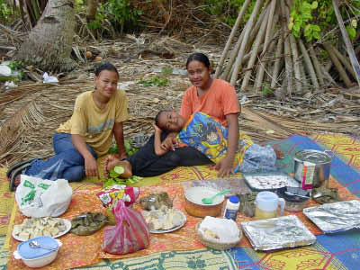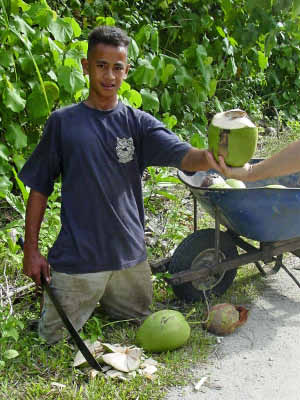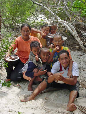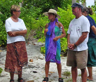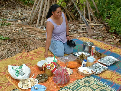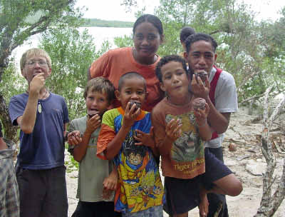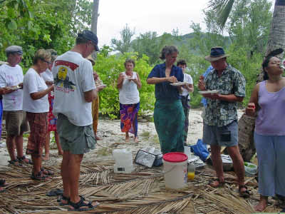 We stopped at Sia's house to trade for some fruit. She gave us papaya, mangos, breadfruit and bananas in exchange for a plastic basket, rice, flour, garlic, T-shirts and ziplock baggies. That evening we were invited to attend a community dance that was held very close to the anchorage. We were enthusiastic in spirit but by the time 8 pm came, we were just too beat and settled for listening to the music from our boats. We have found that our bodies really know that 8 o'clock is our bedtime now and it is a struggle to stay awake past that time! | ||