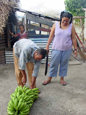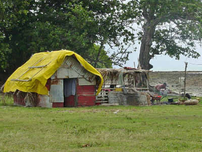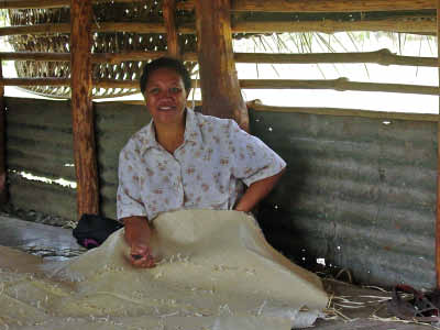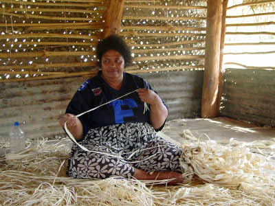 ![]() View of third village ![]() Women stripping leaves and weaving. Each mat takes a month to make. |