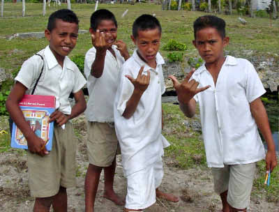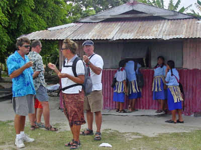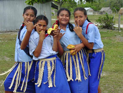 Village School The school uniforms were very unusual. The boys wear a wrap around their lava lavas and the girls wear a woven Kia kia over their skirts. And all the girls have braids with bright red ribbons. I befriended some schoolgirls who were happy to show off their outfits for the camera. |