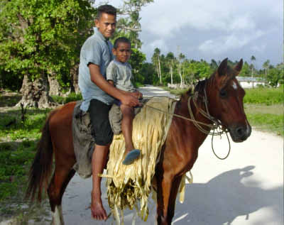 Along the road, we met Simon who was using his horse to collect the palm fronds that had been soaking in the sea and were to be used to weave mats. Simon is about 14 years old and befriended us quickly. By the time we got back to the boat we were pretty tired from the long walk so sacked out with a movie. | |