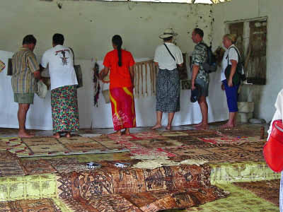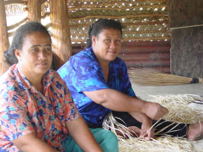 September 22 We found Simon's house and he willingly agreed to take us up the mountain. The path cuts through sometimes dense brush... you really have to know the way and Simon made the hike much more lively with his bits of information, his singing, and his teaching us some Tongan words (including the swearwords). The hike took us through plantations and jungle but proved quite difficult and very steep so Bob and Becky decided not to continue to the very top. We were pretty tired and sweaty when we reached the summit but the views were spectacular. We continued through the brush to the other side of the ridge for another view and a trip to the small cave in the lava rock. The steep walk down the mountain, sometimes sliding on our butts, didn't take too long. Simon took us to his village and we met some women in his family (who's names all started with the letter "L). They were sitting in their fale weaving mats and got a kick out of having their pictures taken. |