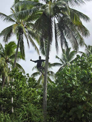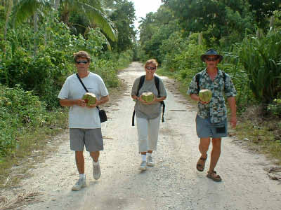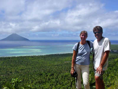 September 23 Donna and Marv decided to take a hike up the neighbouring volcano island. We opted out for a day of snorkeling and whale watching. We joined Bob & Becky (Stardust) in a trip across the reef in the dinghy in search of a closer look at the humpback whales. We were not disappointed as they were soon seen frolicking around the boat. It was an awesome sight to see them flipping their huge fins out of the water, spy hop at us, then their tails would stand straight up as they sounded, to reappear again close by. We were hoping that the whales would come close enough for us to jump in the water and snorkel with them, but they were a little too illusive. So we opted to snorkel for a while on the reef instead, listening to their magnificent sounds that resonated underwater. Touring the Island Later that afternoon, Leuti (the customs official) picked us up in his van to take us for a tour of the island in exchange for the opportunity to practice his English. It was interesting to see the numerous plantations inland and get a feel for their meagre subsistence lifestyle. And Leuti's English improved significantly in no time at all.