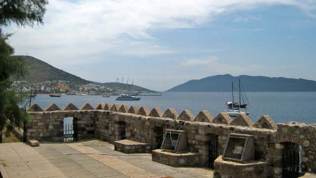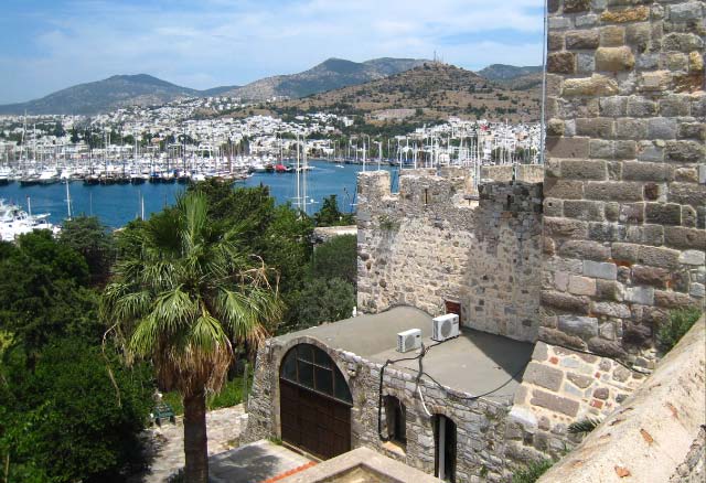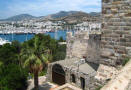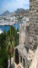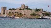 | The Castle of St. Peter stands sentinel over the town of Bodrum. Gulets and other boats dot the anchorage in the twin bays separated by the castle. |