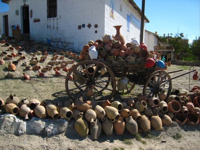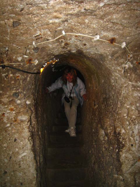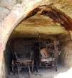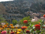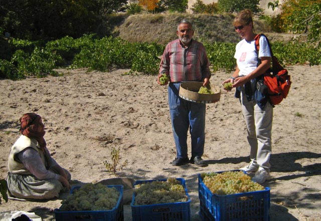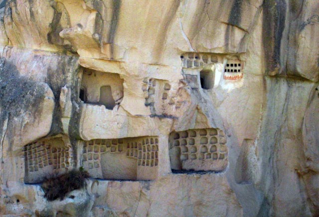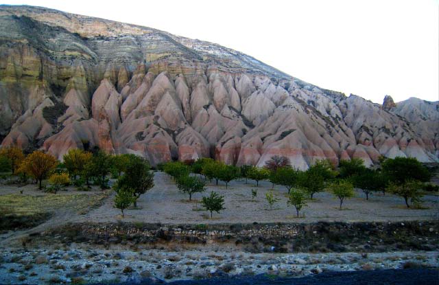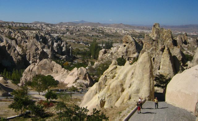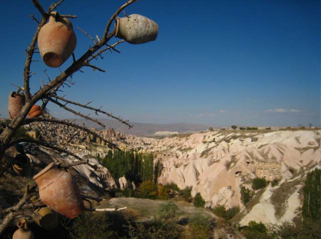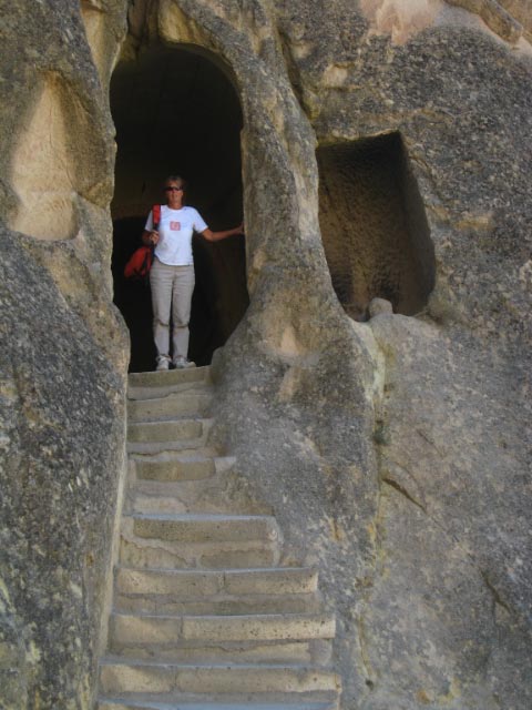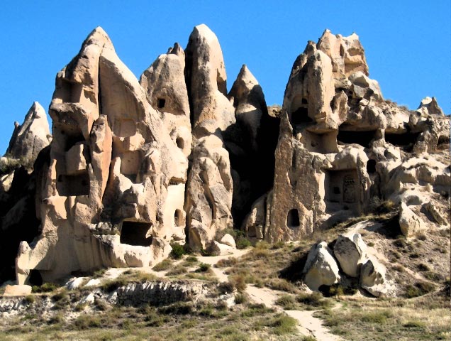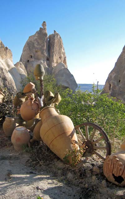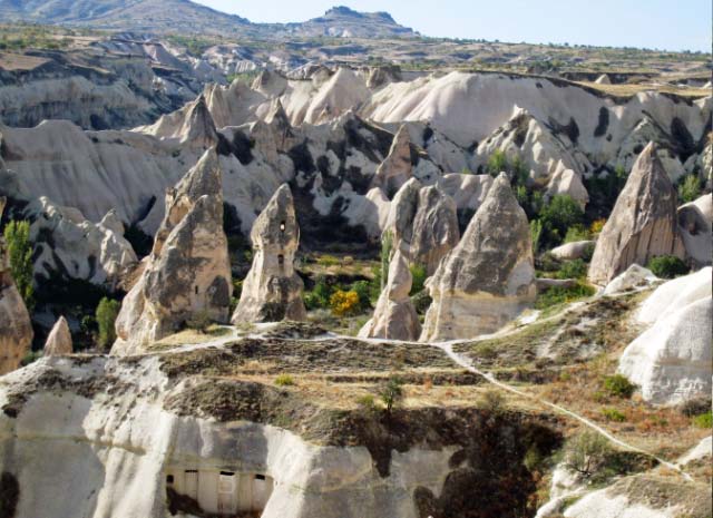 An amazing example of the rock cut monasteries is the Kislar Monastery. Ladders were used to reach the upper levels. | Hiking Pigeon Valley Immediately behind our hotel was the beginning of the trail through the floor of Pigeon Valley that ended at Uchisar. The trail, more like an old creek bed, meandered through through vineyards, olive and fruit trees, and grape vines separated by stunning pinacles of fairy chimney rock and towing tufa cones. |