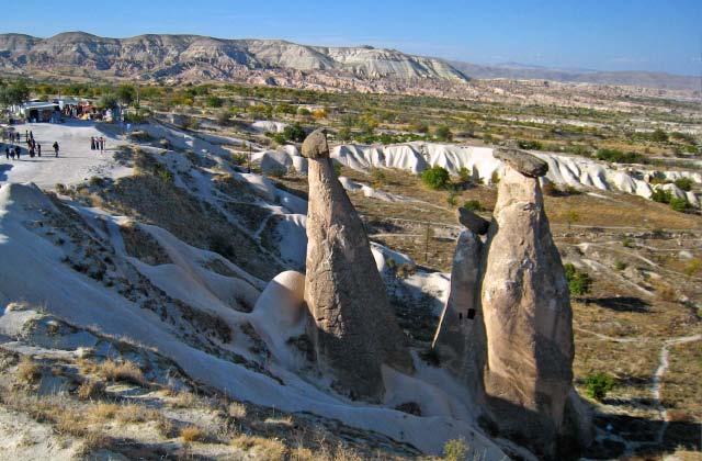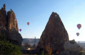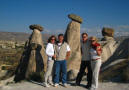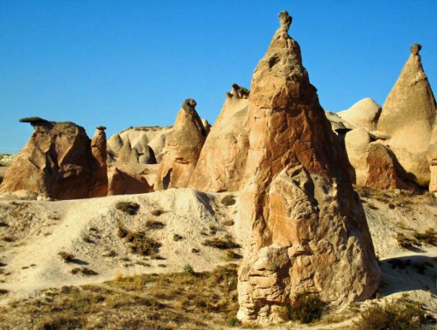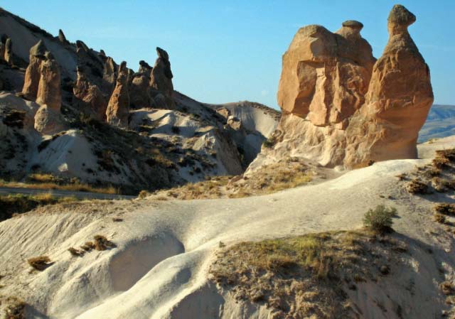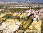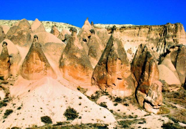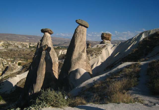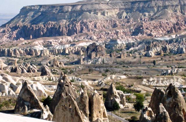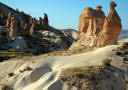 How the rock formations were made: The Cappadocia region is surrounded by 3 now dormant volcanoes, which 30 million years ago, erupted, covering the area with different layers of easily eroded volcanic ash called 'tuff'" overlain in places by layers of hard volcanic rock. With the passing time, the wind, rain and changing temperatures eroded the tuff to make incredible shapes. "Fairy Chimneys" were created by high projections of tufa, capped by the harder top layer of basalt. The basalt served to shelter the underlying soft tufa from the elements that wore away the stone. |