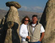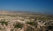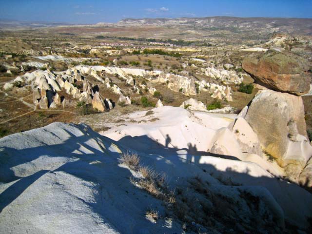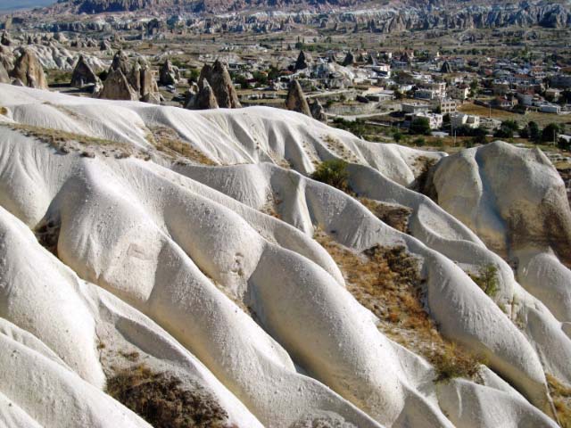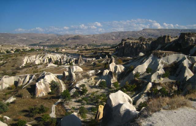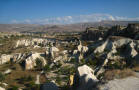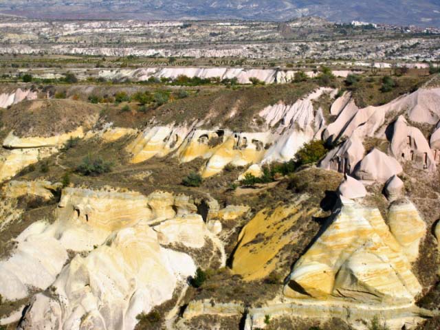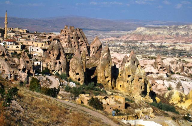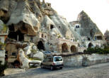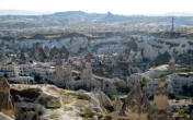 Goreme After the rather monotonous drive the last 200 miles before Goreme, we descended into a large valley with its limestone "sand dunes" and strange conical shaped spires, speckled with holes cut into the rock. |