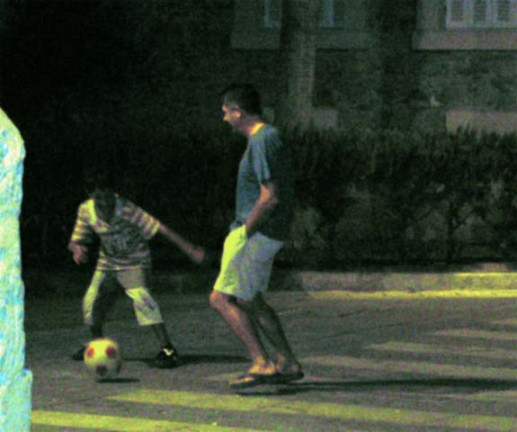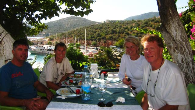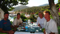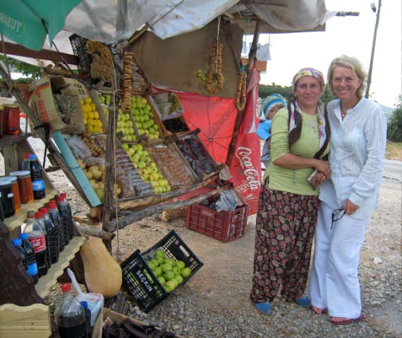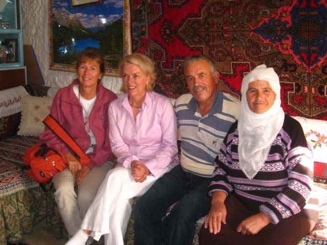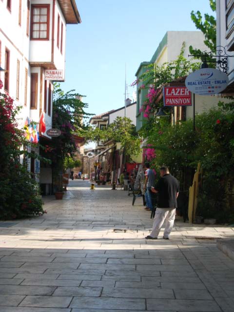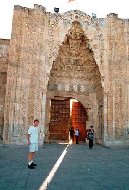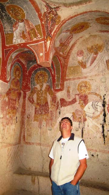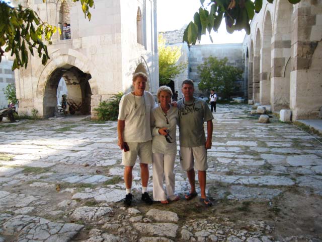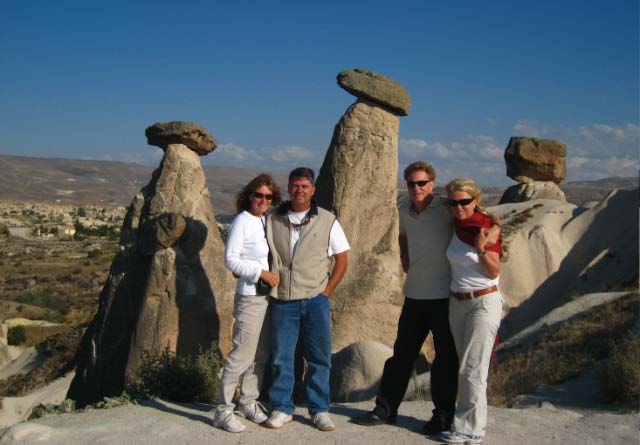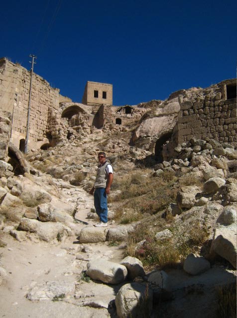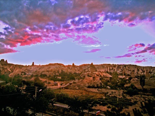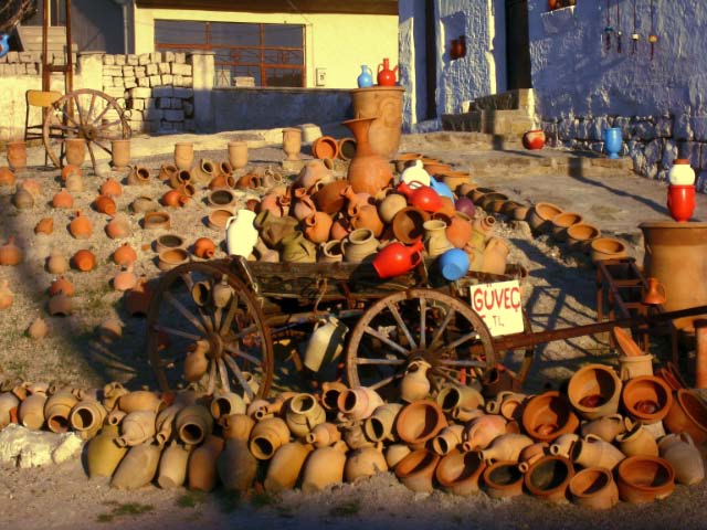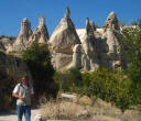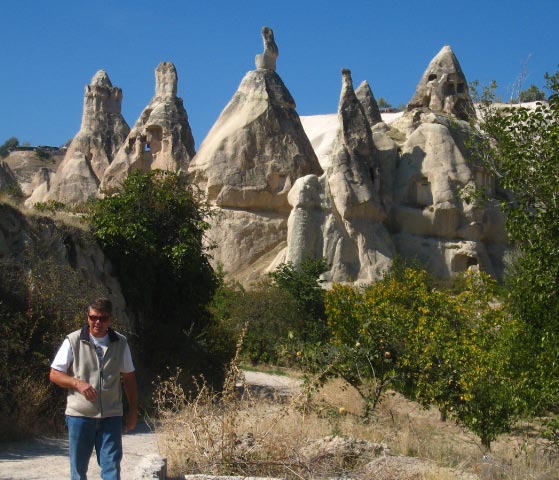 Around Goreme Town We had a full day of sightseeing and it was starting to get dark when we returned to Gorome. The town of Goreme is small and quaint with many little pensions scattered amidst the hilly surrounds. Lots of restaurants to choose from, but we soon found our favorite dig that served delicious borek and other Turkish delights by a very social cook and staff that soon became great friends. Bruce got right into party mode in the street to the beat of the Turkish music! | ||