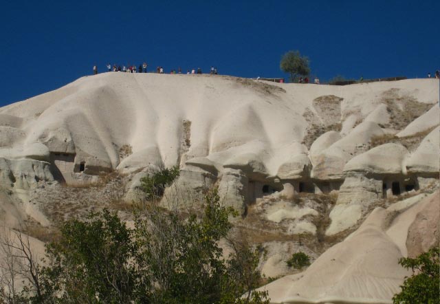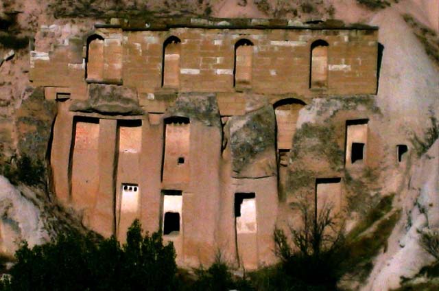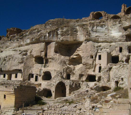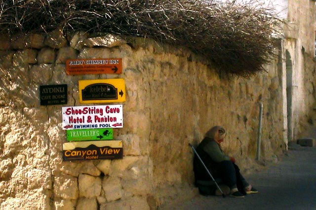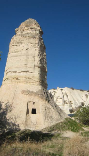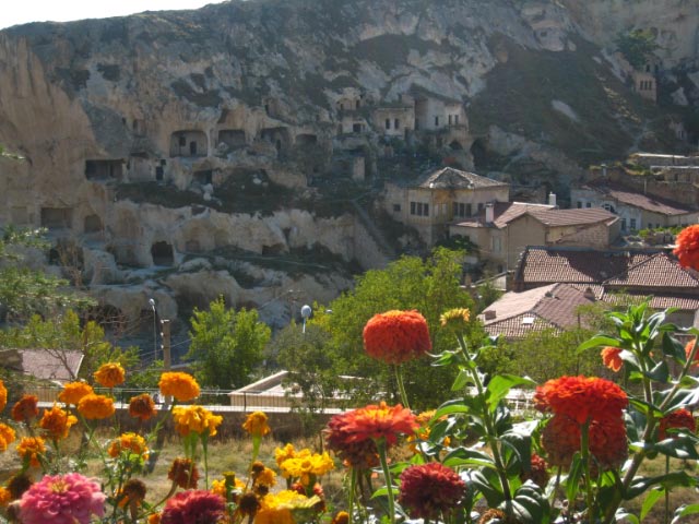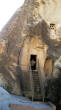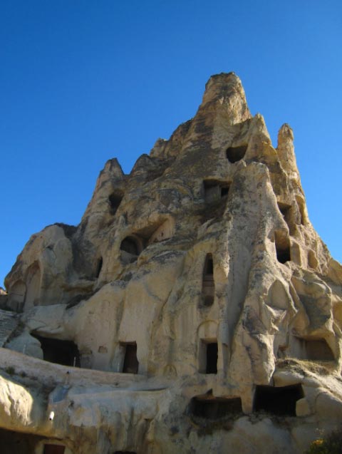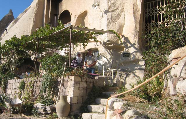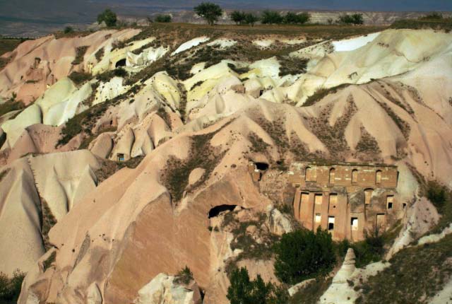 October 8/08 When you live amid a landscape composed primarily of porous volcanic tufa, it doesn’t take long before you realize, “Hey, I could make a great house out of this stuff." | In fact many hotels, restaurants and pensions in Goreme are hollowed out of the rock. Some of the resort hotels are very high-class and expensive. |