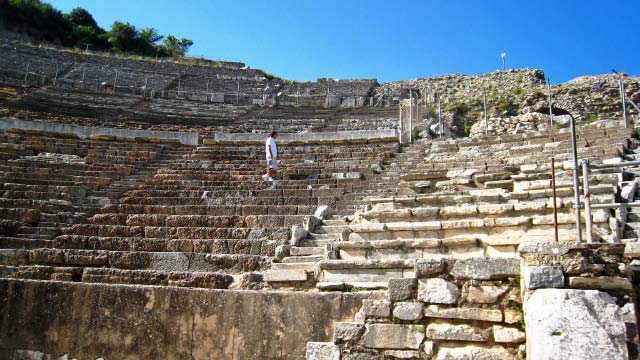 The Odeion Built into the slope of the hill, the Odeion was a smaller open air theatre that could seat 2,200 people, used for poetry-readings, small concerts and prize-giving ceremonies In the foreground were the ruins of the The Town Hall where the seats of the government of the city-states were located. |