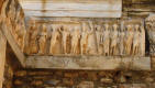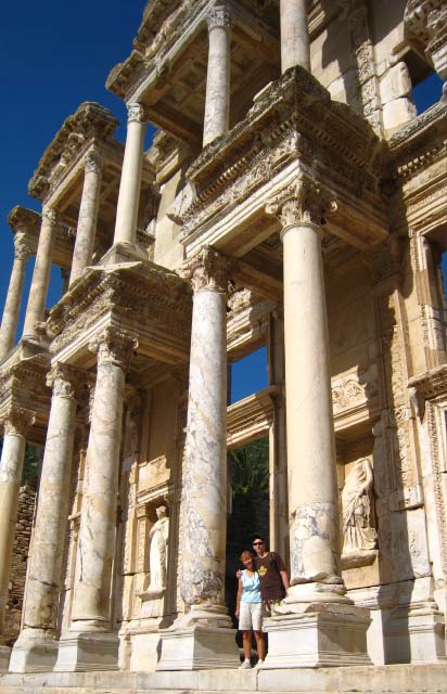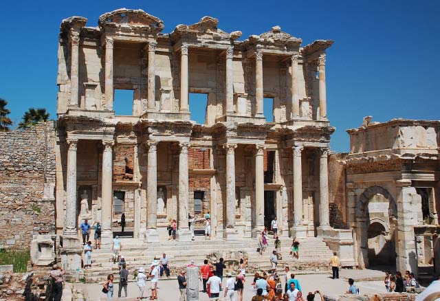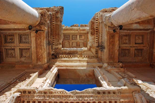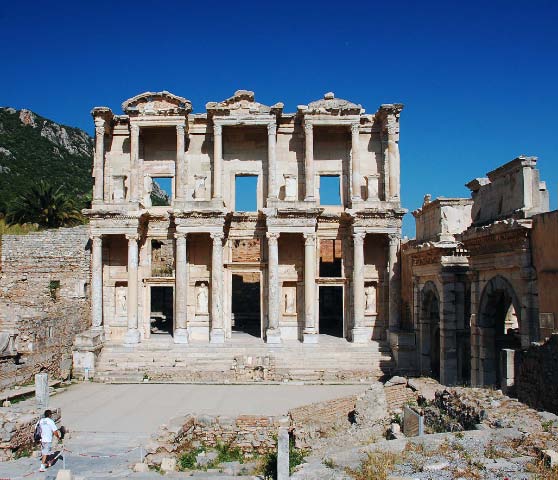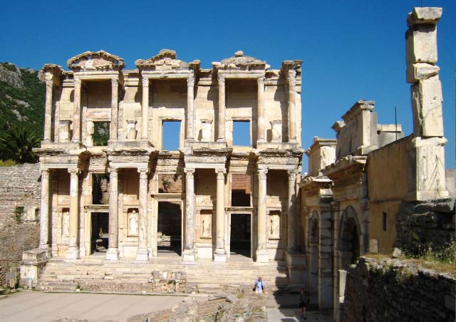 | After passing through a marble-paved courtyard 21 meters wide and ascending some marble steps, we reached the reading room. The library held 12,000 scrolls in niches around its walls. A one-meter gap between the library's inner and outer walls protected the valuable books from extremes of temperature and humidity. | A section sixteen meters high was very richly decorated with a raised column, door ornaments and sculptural architectural monuments, carving and decoration. |