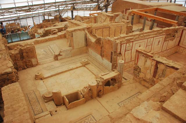 Terraced Houses For an additional admission fee, Chris toured the hillside houses which were in the process of restoration. they were inhibited by the most qualified and wealthy social class. Each house had a door which opened onto the side street from a terrace and a courtyard surrounded by rooms. The houses were heated by a system similar to the one used in spas. The inside rooms had frescoed walls depicting especially mythological subjects, while the floors were usually adorned with refined mosaics. |