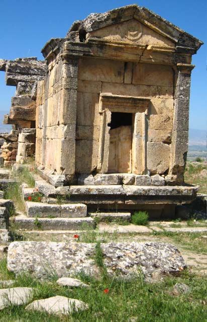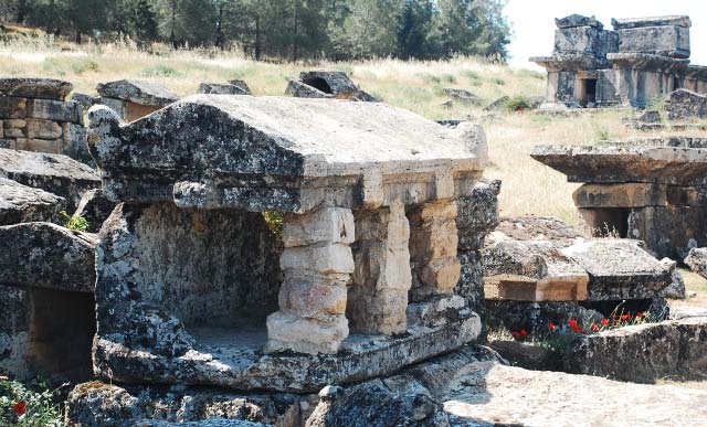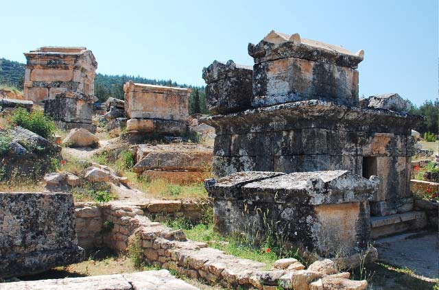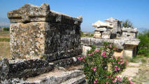 Necropolis of Hierapolis Upon entering the site, we came upon the north necropolis (graveyard), the largest in Anatolia. It contains more than 1,200 tombs of various types, including tumuli, sarcophagi and house-shaped tombs from the Hellenistic, Roman and early Christian periods. Some have Jewish inscriptions. |