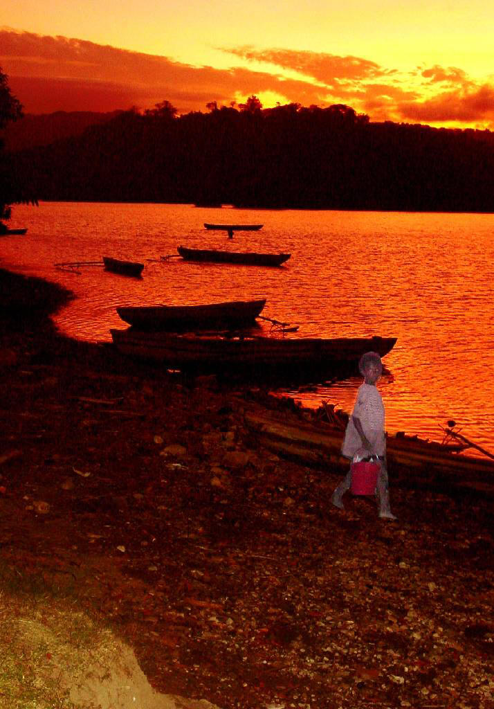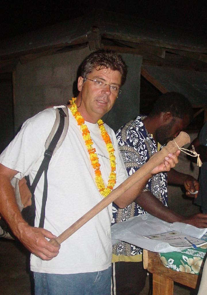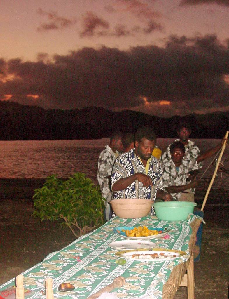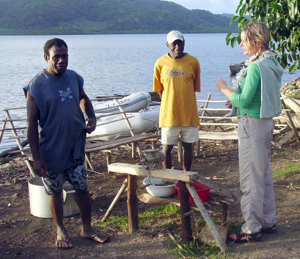 Emma watches the preparation of the kava, which is much stronger than Fiji kava. They actually use a meat grinder instead of using the method of pounding the root as is done in Fiji. The little lights from burning lanterns are common nighttime sights marking the location of Kava Bars.