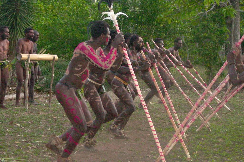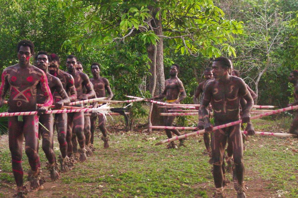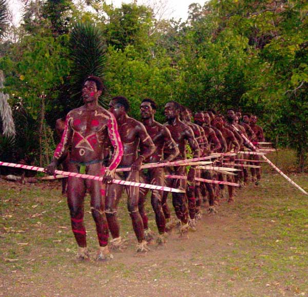 The Namba Chicken Dance Begins The young men wore the traditional Nambas, the leafed covering worn over the male genitalia by those living the traditional village life. Their bodies were decorated with red, white and black paint. They carried large sticks, which they thrust into the ground as part of their choreography. | ||