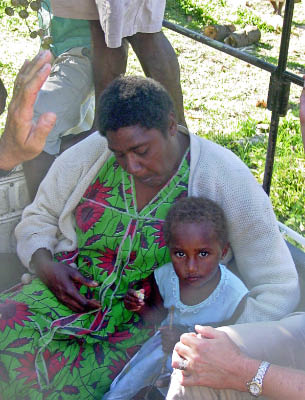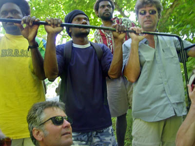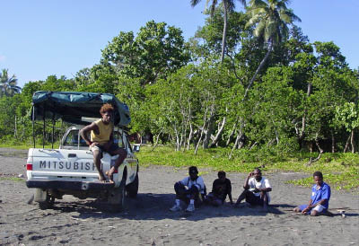 After formalities were completed, we hopped back in the truck for our long dusty journey back to Port Resolution and back to the boats. Looking like we just emerged from a coal mine, we had just enough time to wash all the sand, soot and volcanic ash off our faces before returning to the beach with Endless and Freefall and climbing back into the truck. This time our destination was the Jon Frum village where followers of the strange "cargo cult" live. The history of this village is a story within itself. |
