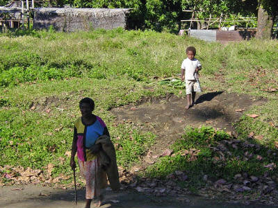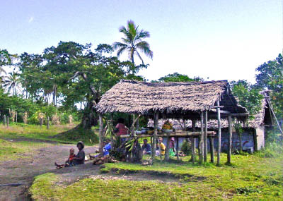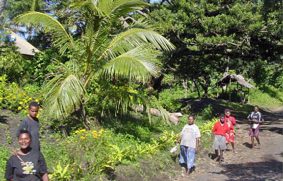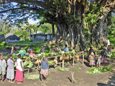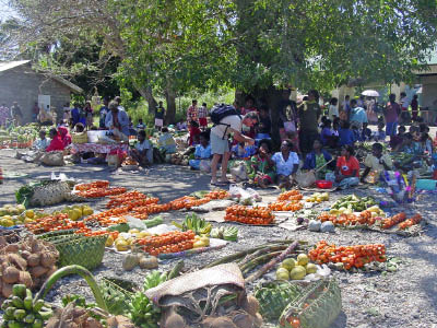 The Market was an event not to be missed. All kinds of fruit and vegetables, interspersed with live chickens, packets of meat lying in the sun, woven tobacco, and baskets were offered by women who lazily relaxed under the shade of the Banyan Tree. The prices were unbelievable! With the change I had in my pocket, I was able to buy a huge stalk of bananas, broccoli, cabbage, and a long string of oranges, pamplemouse (grapefruit) and pawpaw (papaya). | ||
