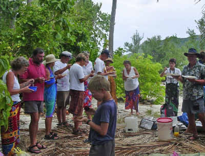 We stopped at Sia's house to trade for some fruit. She gave us papaya, mangos, breadfruit and bananas in exchange for a plastic basket, rice, flour, garlic, T-shirts and ziplock baggies. That evening we were invited to attend a community dance that was held very close to the anchorage. We were enthusiastic in spirit but by the time 8 pm came, we were just too beat and settled for listening to the music from our boats. We have found that our bodies really know that 8 o'clock is our bedtime now and it is a struggle to stay awake past that time! | ||
