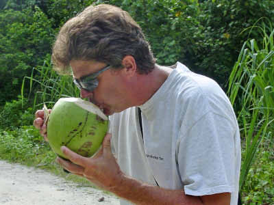 September 23 Donna and Marv decided to take a hike up the neighbouring volcano island. We opted out for a day of snorkeling and whale watching. We joined Bob & Becky (Stardust) in a trip across the reef in the dinghy in search of a closer look at the humpback whales. We were not disappointed as they were soon seen frolicking around the boat. It was an awesome sight to see them flipping their huge fins out of the water, spy hop at us, then their tails would stand straight up as they sounded, to reappear again close by. We were hoping that the whales would come close enough for us to jump in the water and snorkel with them, but they were a little too illusive. So we opted to snorkel for a while on the reef instead, listening to their magnificent sounds that resonated underwater. Touring the Island Later that afternoon, Leuti (the customs official) picked us up in his van to take us for a tour of the island in exchange for the opportunity to practice his English. It was interesting to see the numerous plantations inland and get a feel for their meagre subsistence lifestyle. And Leuti's English improved significantly in no time at all.