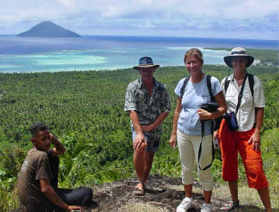 September 22 We found Simon's house and he willingly agreed to take us up the mountain. The path cuts through sometimes dense brush... you really have to know the way and Simon made the hike much more lively with his bits of information, his singing, and his teaching us some Tongan words (including the swearwords). The hike took us through plantations and jungle but proved quite difficult and very steep so Bob and Becky decided not to continue to the very top. We were pretty tired and sweaty when we reached the summit but the views were spectacular. We continued through the brush to the other side of the ridge for another view and a trip to the small cave in the lava rock. The steep walk down the mountain, sometimes sliding on our butts, didn't take too long. Simon took us to his village and we met some women in his family (who's names all started with the letter "L). They were sitting in their fale weaving mats and got a kick out of having their pictures taken. |
