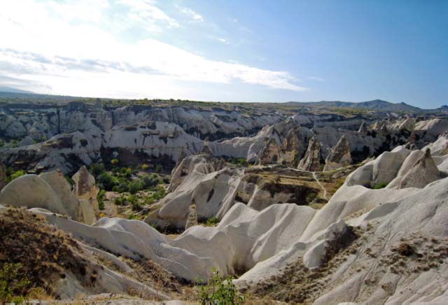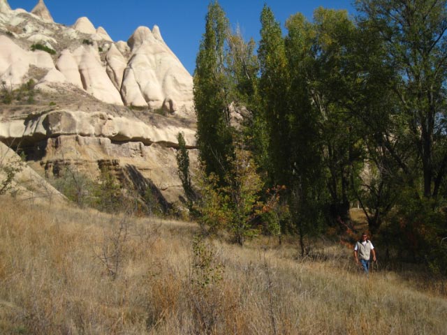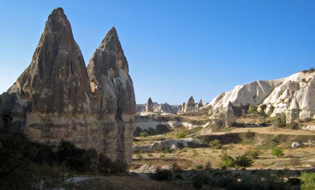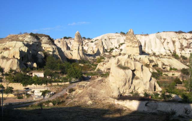 An amazing example of the rock cut monasteries is the Kislar Monastery. Ladders were used to reach the upper levels. | Hiking Pigeon Valley Immediately behind our hotel was the beginning of the trail through the floor of Pigeon Valley that ended at Uchisar. The trail, more like an old creek bed, meandered through through vineyards, olive and fruit trees, and grape vines separated by stunning pinacles of fairy chimney rock and towing tufa cones. |